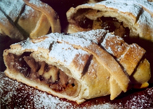 fruit and ice cream, apple strudel or fruit dumplings sprinkled with sugar and